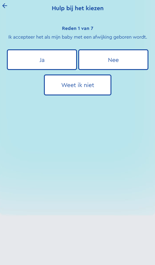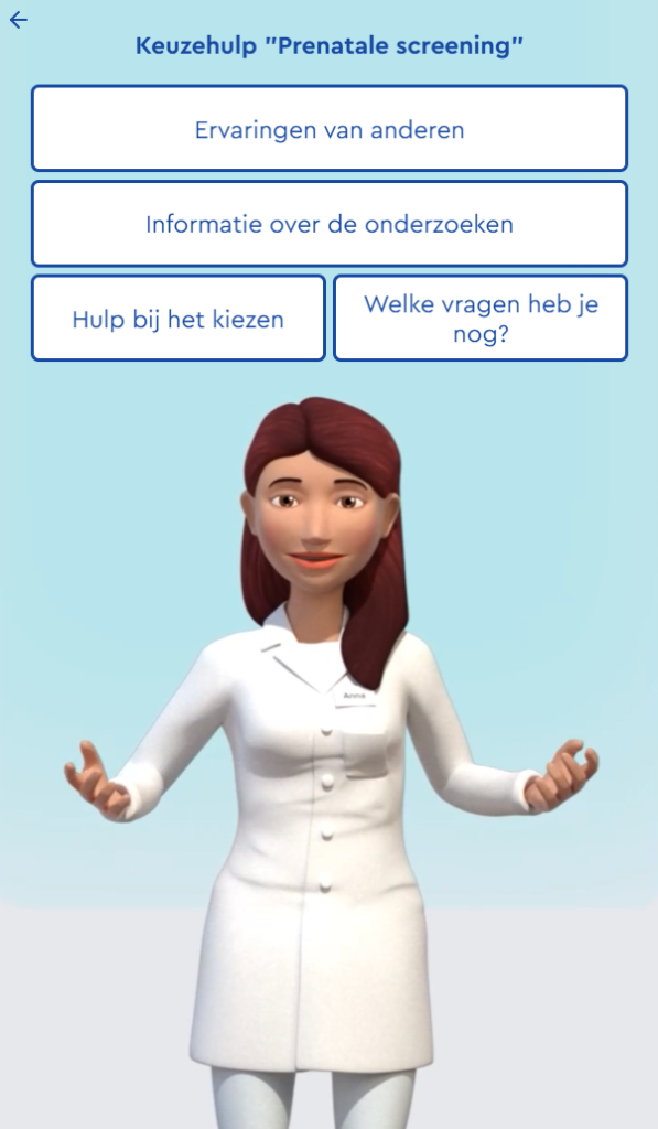 Eerst wordt uitgelegd dat de zwangere zelf kan kiezen of ze de NIPT, de 13-weken echo en de 20-weken echo wel of niet wil laten doen. Daarna ziet de zwangere een aantal redenen die voor toekomstige ouders belangrijk kunnen zijn bij het maken van hun keuze. Bij elke reden kan de zwangere kiezen of deze voor haar wel belangrijk is (ze kan dan op ‘ja’ klikken), niet belangrijk is (ze kan dan op ‘nee’ klikken), of hierover twijfelt (ze kan dan op ‘weet ik niet’ klikken). De zwangere kan vervolgens nog extra redenen toevoegen die niet in het overzicht staan. Verloskundige Anna (de avatar) geeft uiteindelijk een samenvattingsoverzicht dat ook kan worden gedownload en geprint.