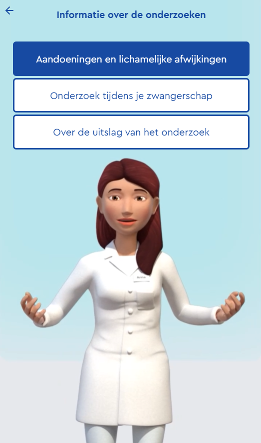 Let op: omdat de keuzehulp gebruikt maakt van een avatar en audio, is het prettig als de zwangere de keuzehulp op een rustige plek of met een koptelefoon kan bekijken.