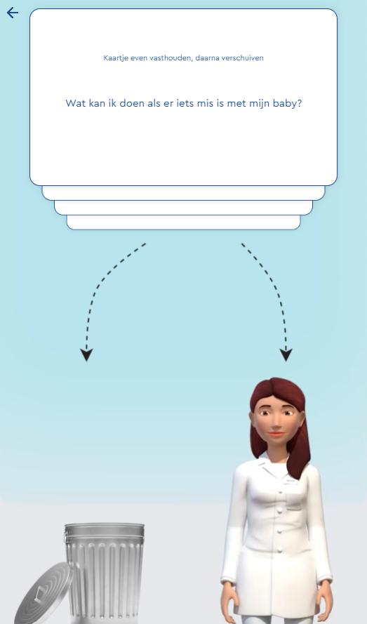 De zwangere kan de vragen die voor haar belangrijk zijn naar verloskundige Anna (de avatar) slepen. De vragen die voor haar niet belangrijk, kan ze naar de prullenbak slepen. Als de zwangere nog andere vragen heeft, kan ze deze vervolgens zelf toevoegen. De zwangere kan uiteindelijk de vragen die voor haar belangrijk zijn downloaden, printen, en meenemen naar de verloskundige of gynaecoloog.