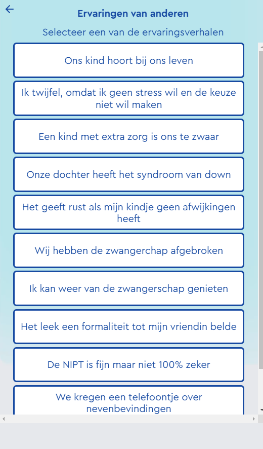 In het onderdeel ‘Ervaringen van anderen’ kan de zwangere ervaringen van anderen bij het maken van de keuze over prenatale screening zien en beluisteren (zie ook de afbeelding).
